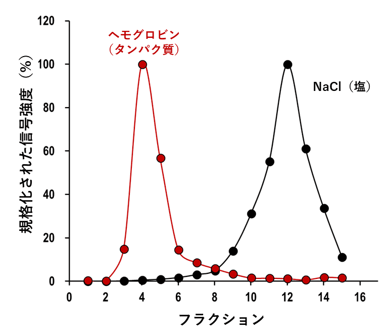 一方、タンパク質のような高分子は穴に入れないため、速い時間で溶出されます。