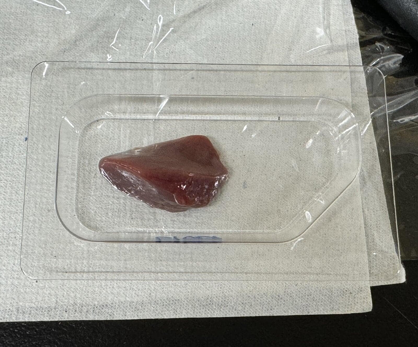 まず、試料を図3のような樹脂容器に入るようなサイズ(数cm程度)に切りました。室温でアスパラガスや鶏レバーのような軟らかい試料は切削が難しいので、凍結固定をする必要があります。切った試料を樹脂容器に入れ、樹脂容器に包埋剤を加え、凍結します。