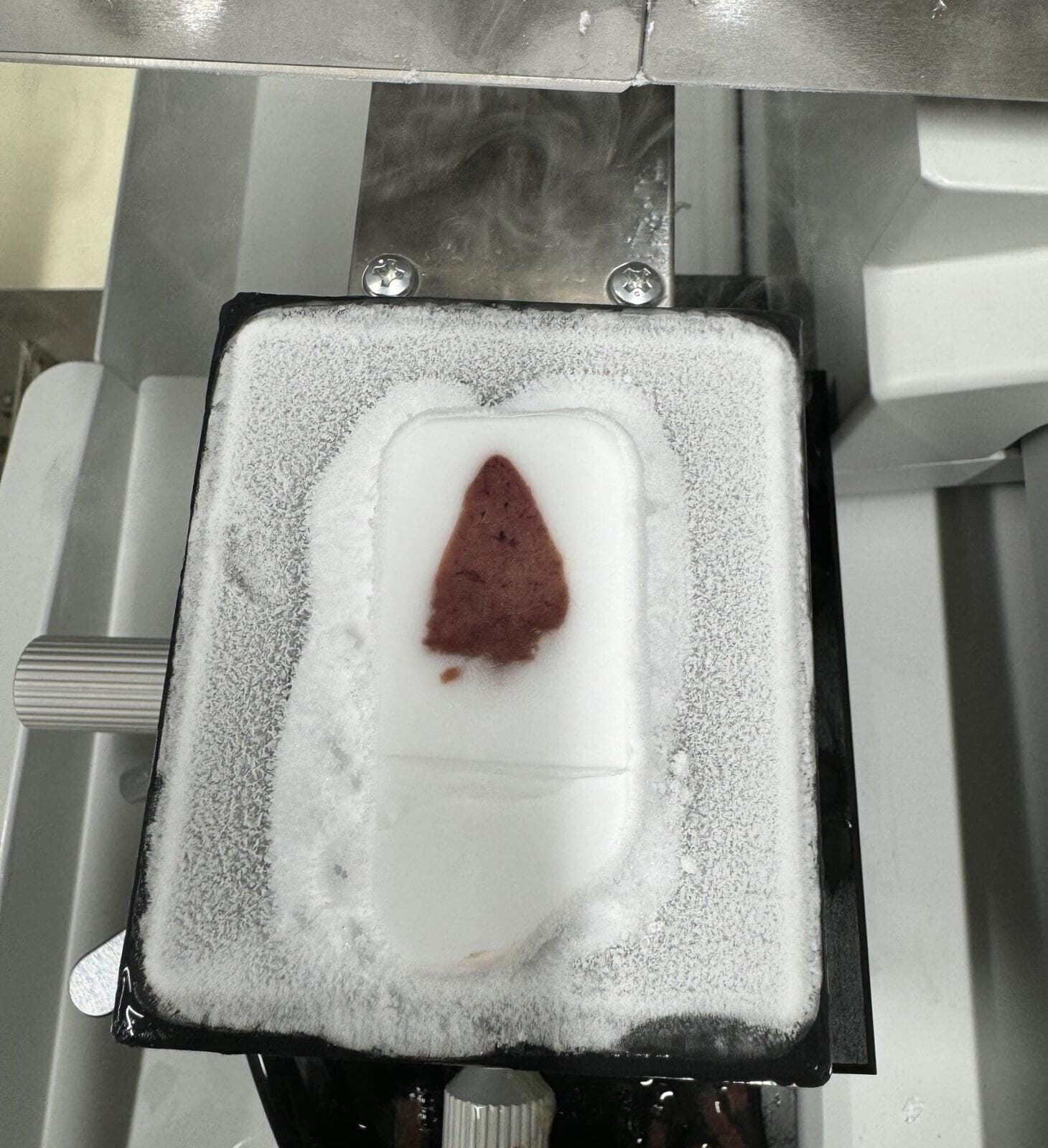 図4 包埋剤を凍結させたらカチカチになります。試料をミクロトームの試料台に載せ、切片作成をします。